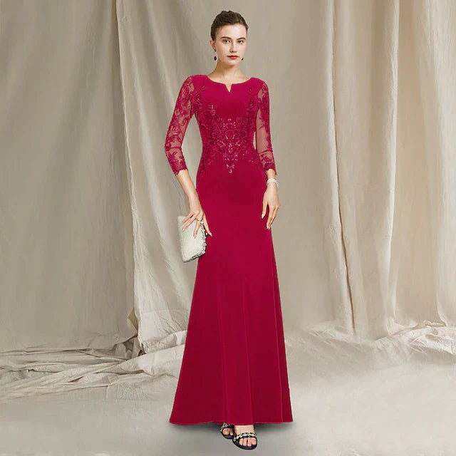 Sheath / Column Mother of the Bride Dress Elegant Jewel Neck Floor Length Chiffon Lace Short Sleeve with Sequin Ruffles Appliques