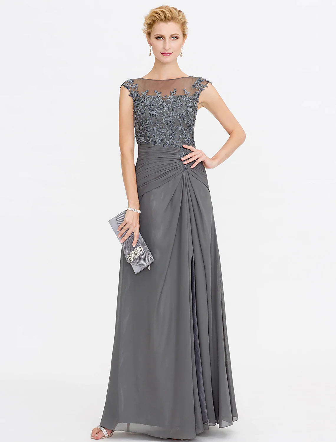 A-Line Mother of the Bride Dress Wedding Guest Elegant See Through Bateau Neck Floor Length Chiffon Lace Sleeveless with Side Draping Fall