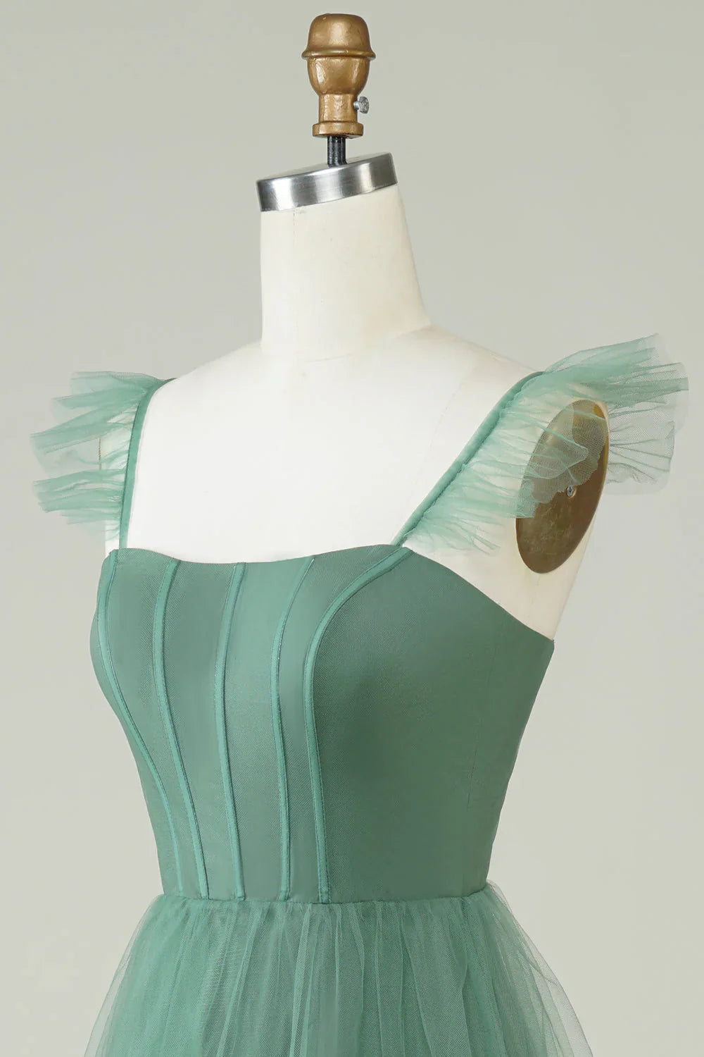 A Line Spaghetti Straps Long Tulle Eucalyptus Bridesmaid Dress