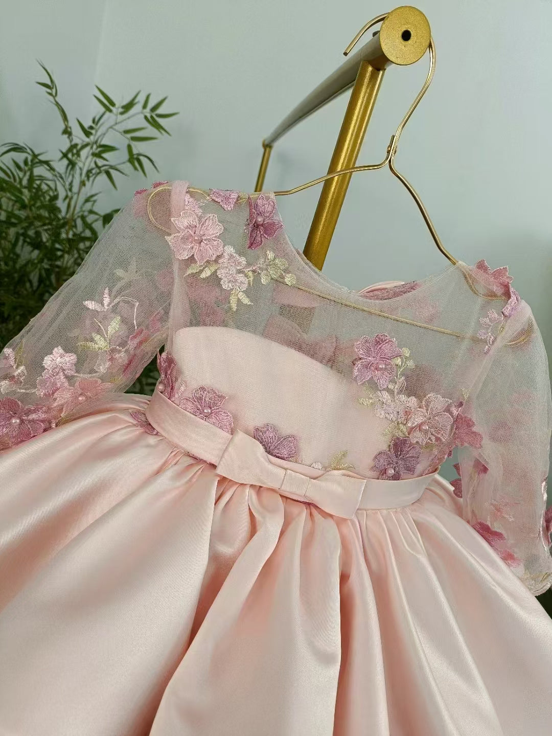 Elegant Pink Girl Bridesmaides Dress Full Sleeve J177