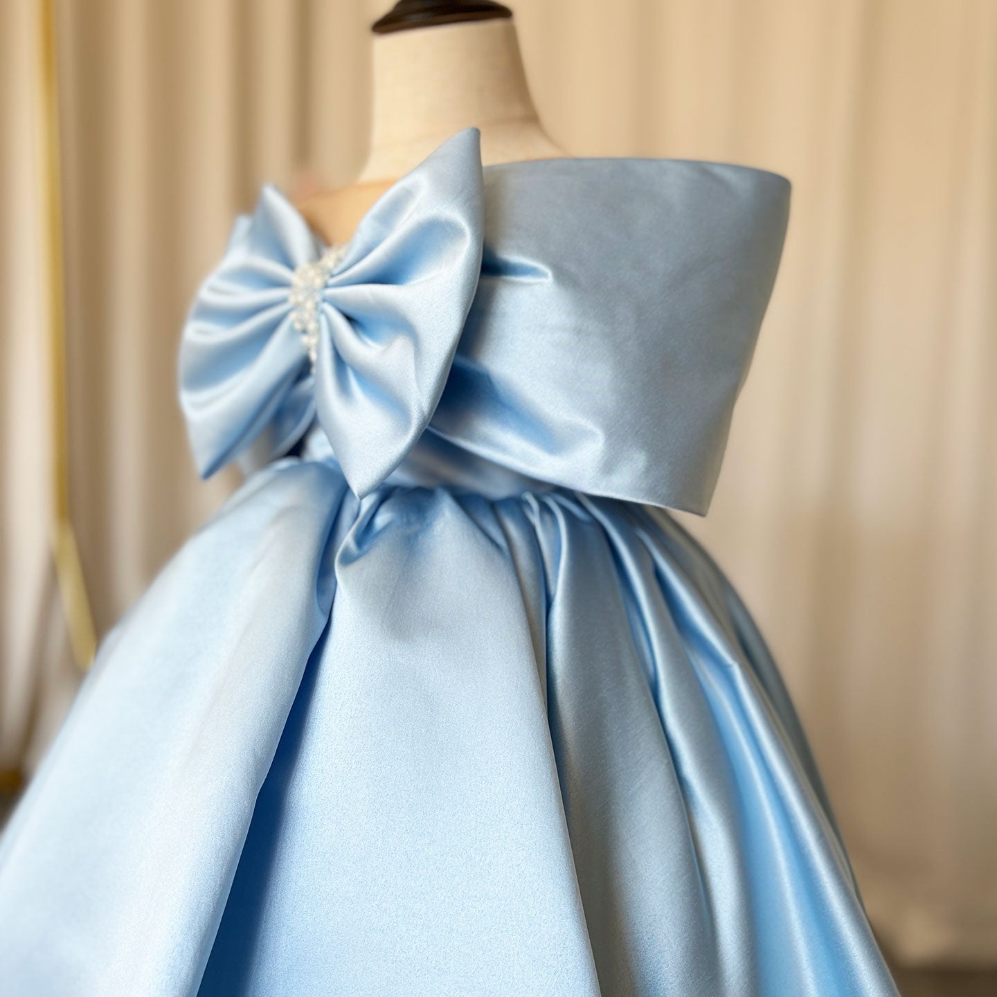 Elegant Satin Beads Flower Girl Dress Blue with Bow Knee Length M181