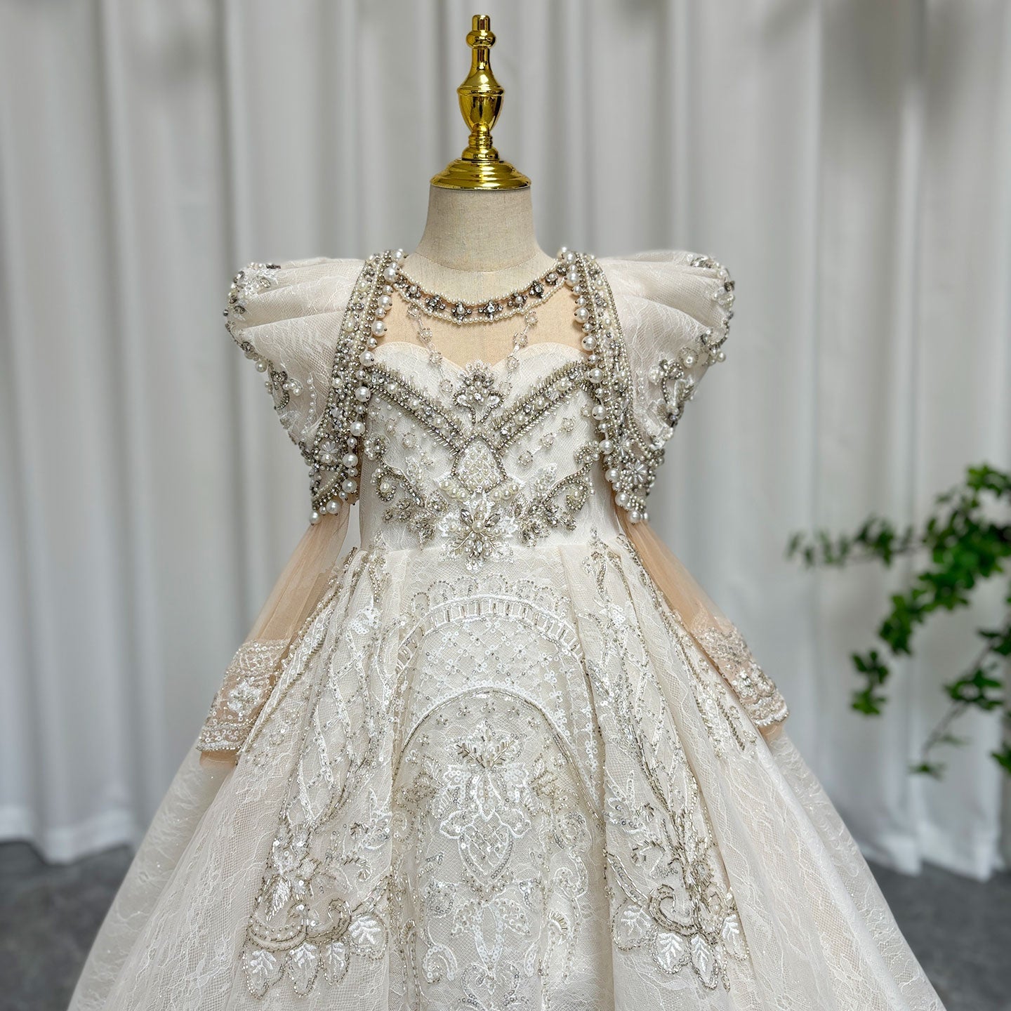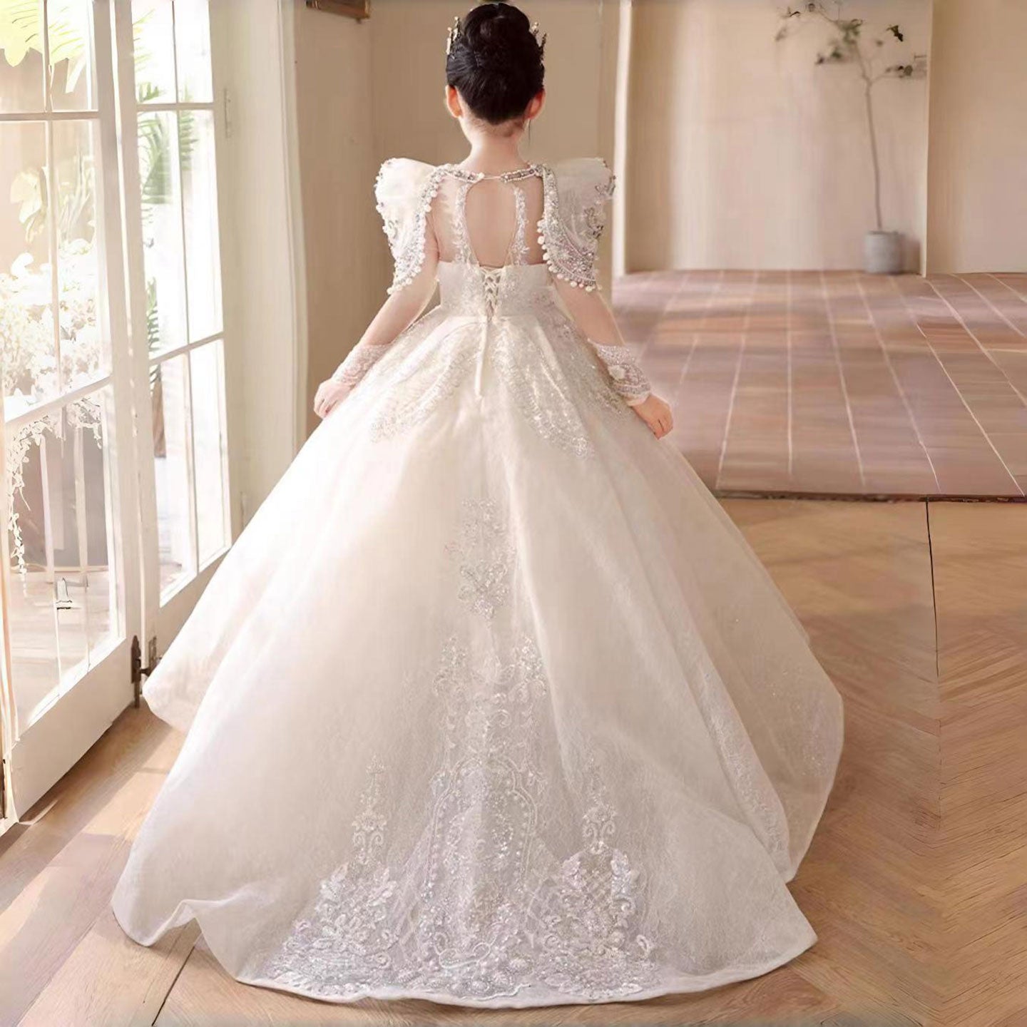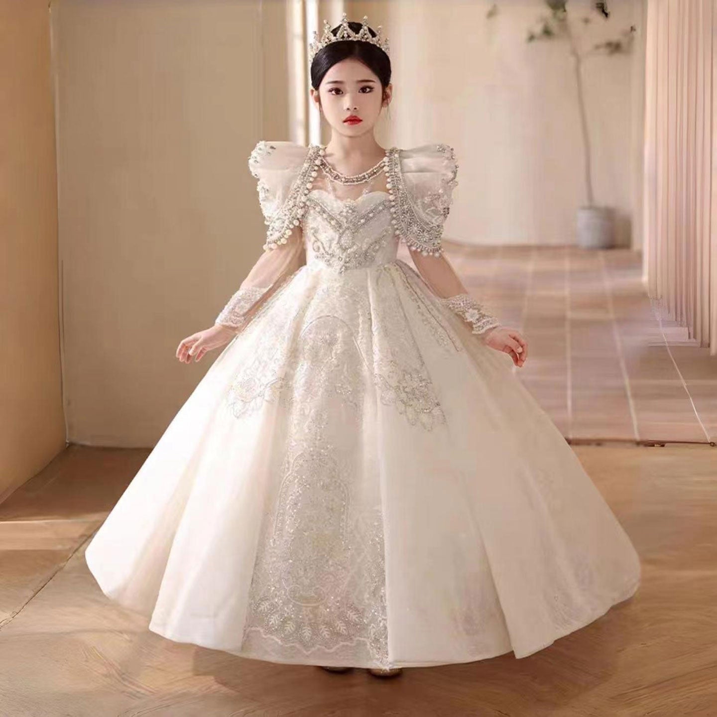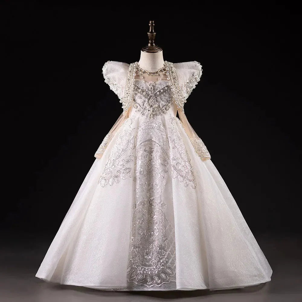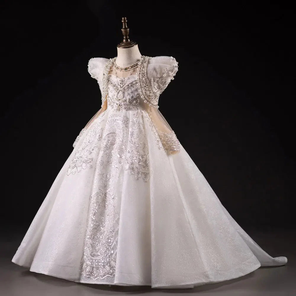 Luxury White Girl Dress Beaded Pearls Dubai Kids Princess Birthday J112