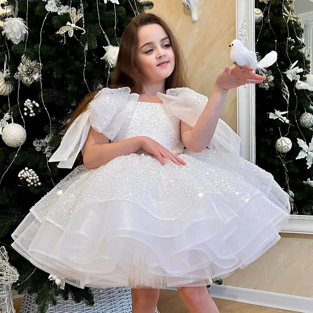 Sparkly White Girl Dress Big Bow Champagne Pink Princess Kids J343