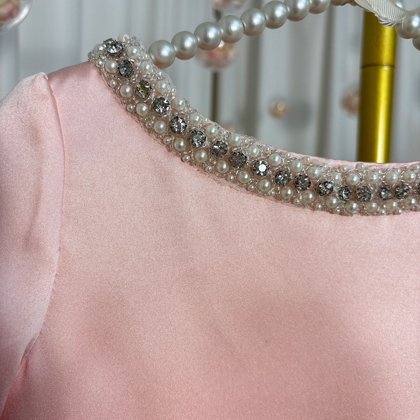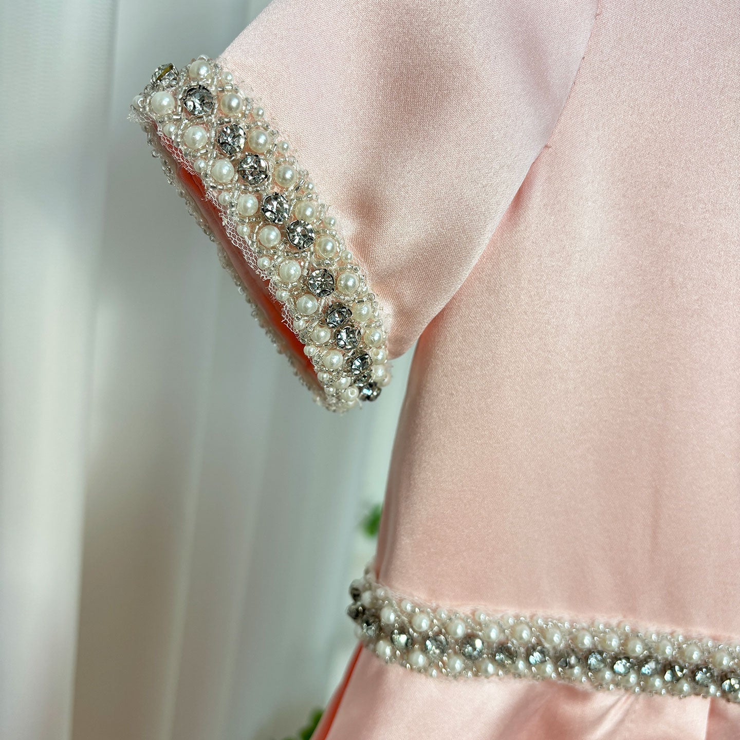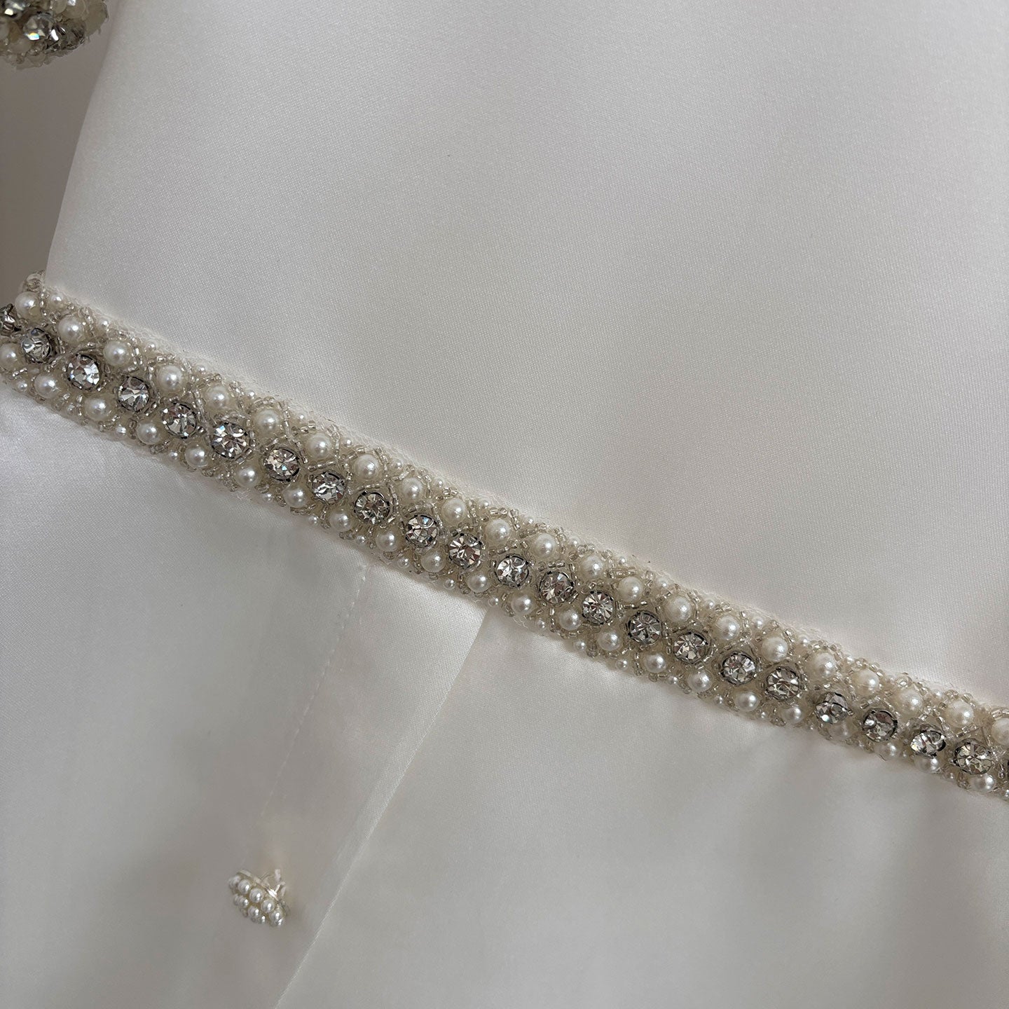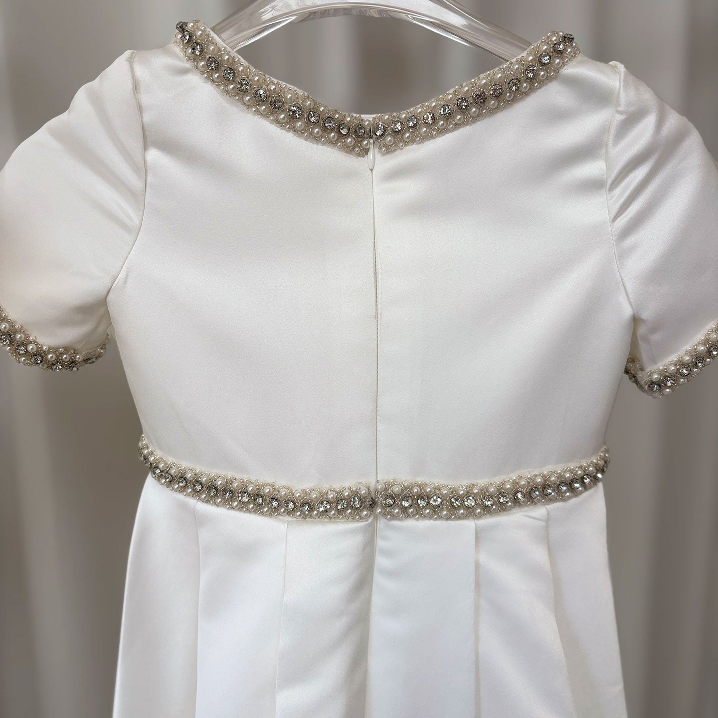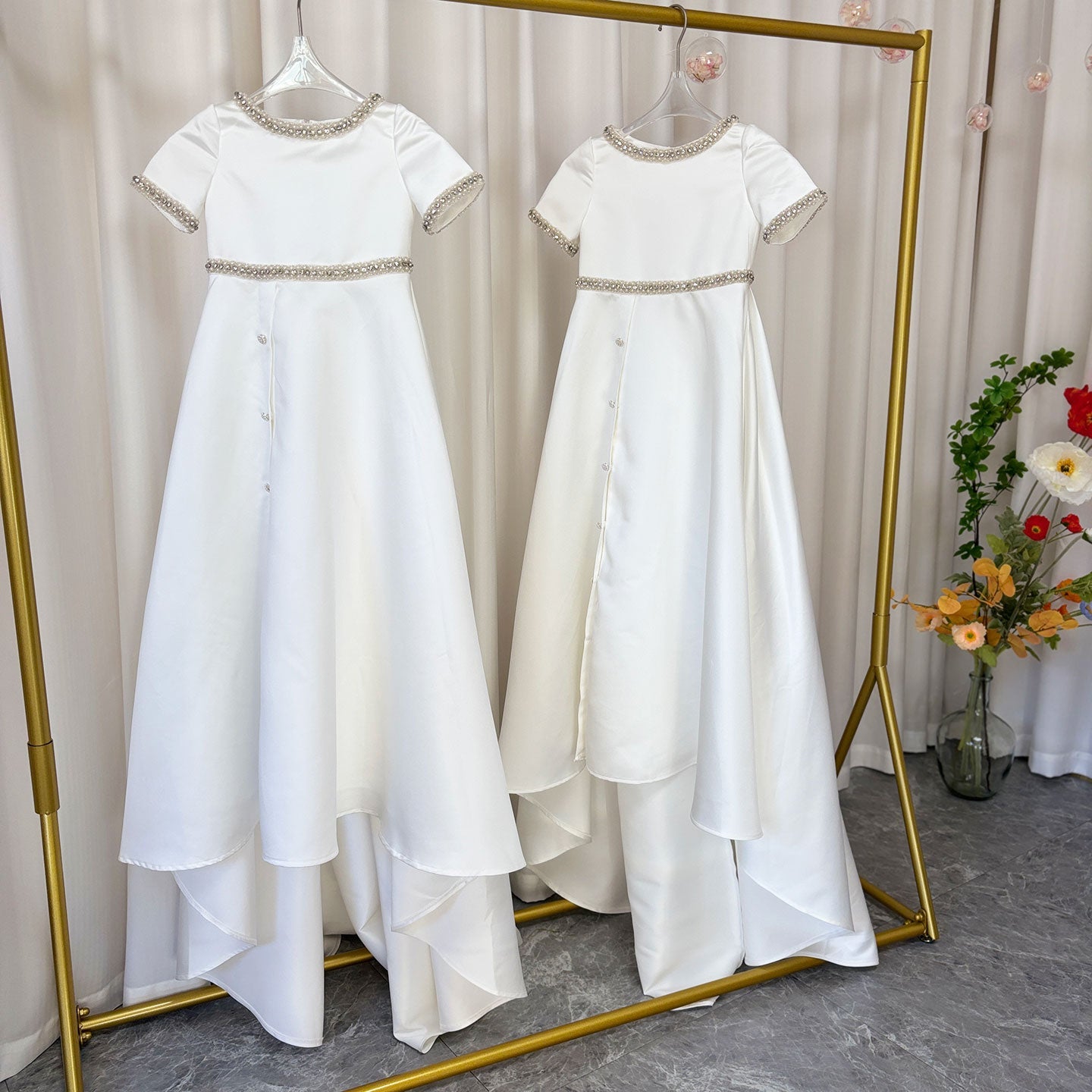 This elegant and enchanting white satin dress is the perfect choice for any first communion or wedding party. Crafted with high-quality materials and designed with precision, this dress exudes sophistication and charm. The smooth satin fabric and delicate details make it a dreamy option for any special occasion.