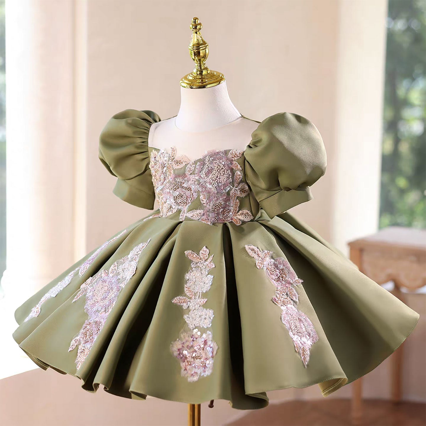 Green Flower Girl Dress Puffy Sleeves for Wedding Birthday Party D107