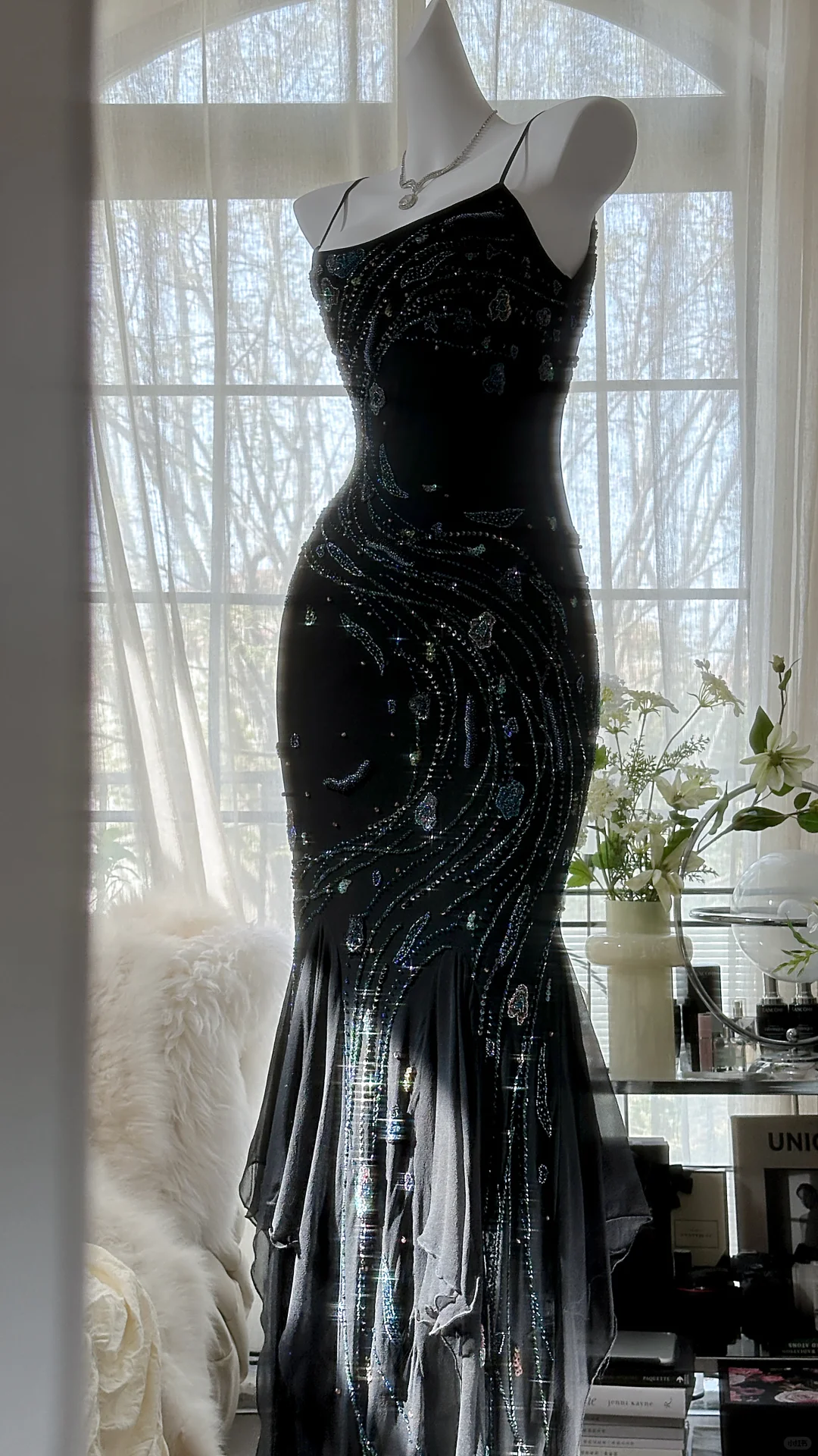 Gorgeous Mermaid Spaghetti Strap Beaded Black Chiffon Party Dress Evening Dress SH2961