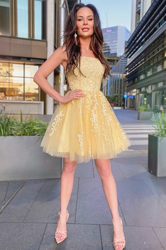Hellodresses Spaghetti Strap Sleeveless Short A Line Homecoming Dress With Appliques