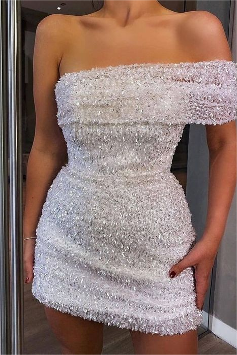White Sequins One Shoulder Strapless Pleated Short Homecoming Dress with Beadings HC0016